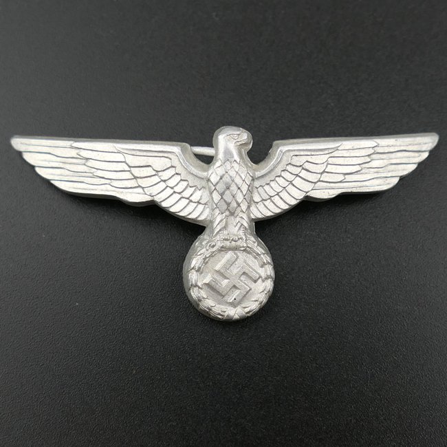 WH (Heer) Visor Cap Eagle (Schirmmützenadler). The aluminum type eagle is complete with all three prongs. The eagle is not visible maker marked. Hard to find Wehrmacht cap eagle in very good condition!