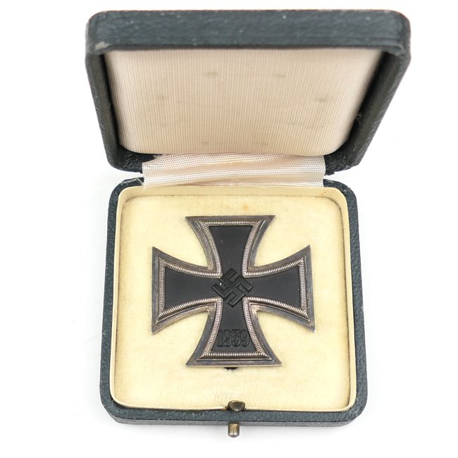 Iron Cross 1st class (Eisernes Kreuz 1. Klasse) that comes in its original 'green' coloured etui as issued. On 1 September 1939 Hitler reinstituted the Iron Cross (First time in 1813). The first class medal was for award to personnel who performed three to five acts of bravery in combat, and had already been awarded the Iron Cross second class. The magnetic cross has a three piece construction, the near mint condition cross shows great detail overall and is showing a nice slightly darkened patina. The cross is not visible maker marked but can be attributed to production by the company of 'Klein & Quenzer AG' from Idar-Oberstein. The cross comes with its original rare green coloured case, typical for this manufacturer. The case is in very good condition with minimal wear, see photos. These 'green' coloured cases are very hard to find. A nice and desirable set!