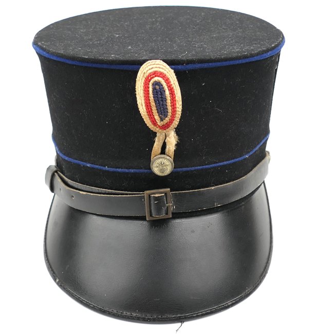 Dutch 'Schalkhaar' Police Kepi (Kepie der Staatspolitie), Model 1928.This is a nice black coloured Kepi as inteded for NCO's within the Dutch State Police (Staatspolitie), also known as the 'Schalkhaar' Police. This was a Police unit during the war, named after the place Schalkhaar near Deventer. In Schalkhaar was the training facility of the unit. This unit was controlled by the Dutch NSB (Nationaal Socialistische Beweging) movement.The kepi is complete with a blackened simulated leather chinstrap. The kepi is complete with its original white embroidered cocarde. The leather sweatband is in good used condition. The Kepi is not visible maker marked. Nice original Kepi in good condition