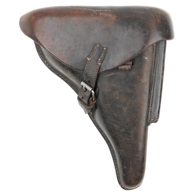 Wehrmacht P08 Luger Pistol Holster (Pistolentaschen P08). When issued the P08 came with a specific holster to be worn on the left side of the load carrying waist belt. World War 1 Luger Pistol holsters were of course still in use with the P08 pistol during World War 2. The black coloured leather construction hard-shell holster has two belt-loops on the back. There is a small leather pocket in the interior of the top flap, intended for the quick loading tool. The holster is nicely maker marked by the company 'Gebrüder Klinge' from Dresden and dated 1939, it is 'WaA' marked as well. Nice original Luger pistol holster in very good condition!