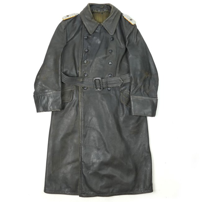 Luftwaffe Flight/FJ Major's Leather Greatcoat (Ledermantel). The Greatcoat belonged to the standard equipment of every soldier. The greatcoat could be worn in cold weather or rain and all other conceivable situations. Officers were entitled to wear a leather version of the standard greatcoat as an optional item. This is a privately purchased Luftwaffe grey leather construction greatcoat, it has two rows of six front closure buttons of the early dish-type. There is no metal hook and eye at the neckline, this is typical for Luftwaffe greatcoats, due to the fact that they were allowed to wear their collars open. The heavy quality greatcoat is fully lined with rayon lining material. The greatcoat is having the build in O-ring to attach the Luftwaffe Dagger Hangers through the pocket. The Greatcoat is not visible maker marked or dated. The greatcoat shows normal traces of usage, the leather is still in very good and supple condition. The greatcoat is complete with a pair of removable shoulder-boards as intended for a 'Major der Fliegertruppe/Fallschirmjäger'. Nice original Luftwaffe leather greatcoat in very good condition, this will make a stunning officer's display!