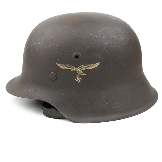Luftwaffe Single Decal M42 Combat Helmet (Stahlhelm M42). The steel construction M42 helmet retains almost all of its rough textured,blue-gray paint and about 98% of the decal.The paint shows normal wear and scratches caused by usage andthe helmet shows some light surface rust and dirt and is in uncleaned condition as found. All three liner retaining rivets are intact. The interior of the helmet is a M31 leather liner with all eight fingers intact, the liner is size '57' marked. The liner is complete with its original drawstring. The shell is marked with maker and size 'NS64' which indicates production by the company 'Vereinigte Deutsche Nickelwerke AG' from Schwerte. The reverse interior neck guard apron has a stamped serial number '2257'. There is a nice dome-stamp inside the helmet shell. The helmet is complete with its original maker marked chinstrap. Nice original Luftwaffe M42 helmet in very good condition!