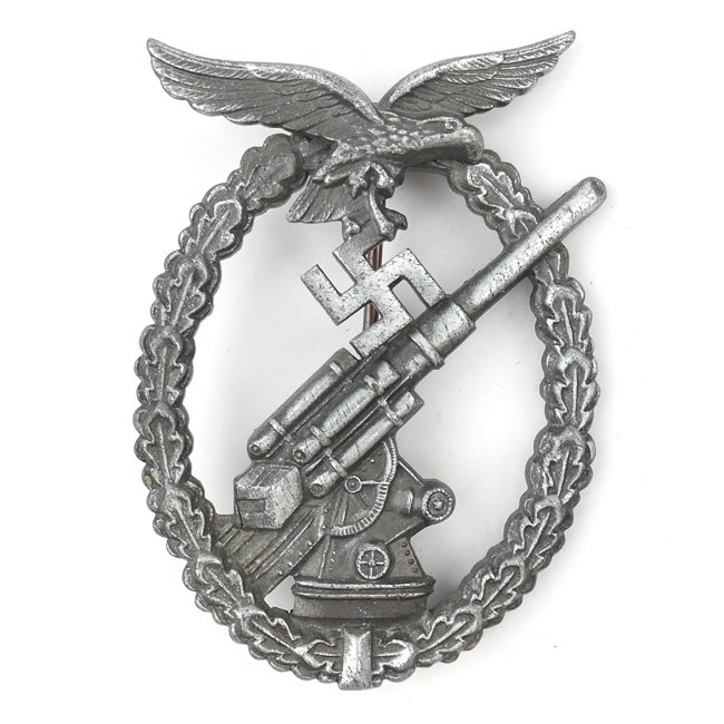 Luftwaffe Flak Artillery War Badge (Flakkampfabzeichen). The Flak Artillery War Badge was introduced by 'Reichsmarschall Hermann Göring' on 10 January 1941, for award to air defence crews including searchlight and sound detection personnel. The badge is a nice 'Zink' example showing great detail. The zinc-type badge is nicely maker marked 'GWL' indicating production by the company of the 'Gebrüder Wegerhoff' from Lüdenscheid. The pin and catch are complete and functional. Nice original example in very good condition!
