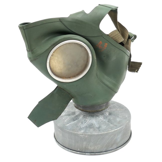 German Luftschutz Gasmask (Luftschutz Volksgasmaske M40). The gasmask is complete with its aluminum filter. The gasmask is nicely 'WaA' marked, the rubber is still supple. Nice original gasmask in very good condition!