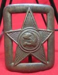 Original era manufacture. Brass frame buckle with the Soviet Hammer & Sickle emblem at the center. Pleasing old brass patina finish, measures 48x60 mm.