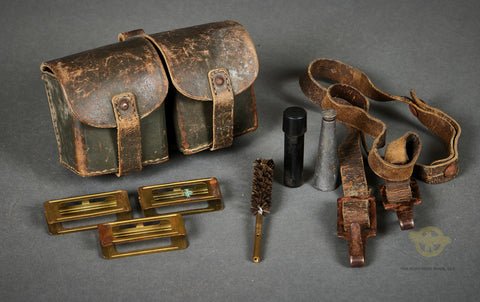 Italian WWII M1907 Rifle part Cartridge Pouch-This two pocket pouch would be worn center body and would be used with the M1907 Fusil M1907/15 Rifle and later the Carcano. This rifle was used during both WWI and WWII. This pouch is made of heavy-duty green leather and has two functional pockets in the front. These close and snap with a green leather strap. There are some contents included with this small ammo pouch. We have the original cross strap sling. There is a cleaning tool and 3 brass clips for the Carcano that are nicely marked. This ammo pouch is in good condition though it is pretty heavily scuffed. The same holds true for the sling. Both should clean up though if you choose to do so. A very interesting little lot. For you that are sensitive to odors, please be aware that this does have a musty smell to it.