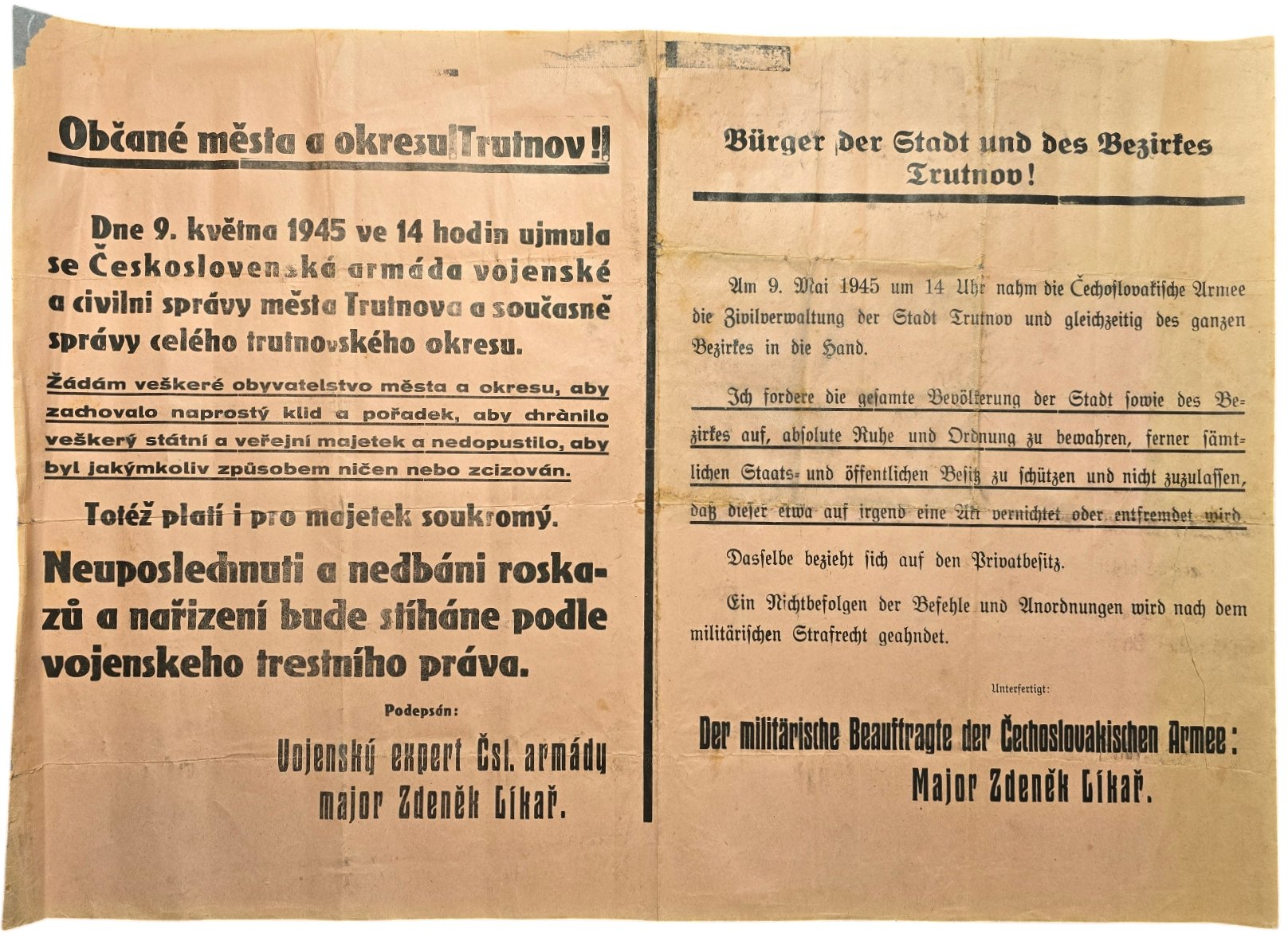 Original WW2 Czech Poster - Liberation of Trutnov, Czechoslovakia, Major Zdenek Likar (1945)Approximately 61 x 43 cm''Bürger der Stadt und des Bezirkes Trutnov!''Originele Wo2 Tsjechische Poster - Bevrijding van Trutnov,Tsjecho-Slowakije, Major Zdenek Likar (1945)Ongeveer 61 x 43 cm