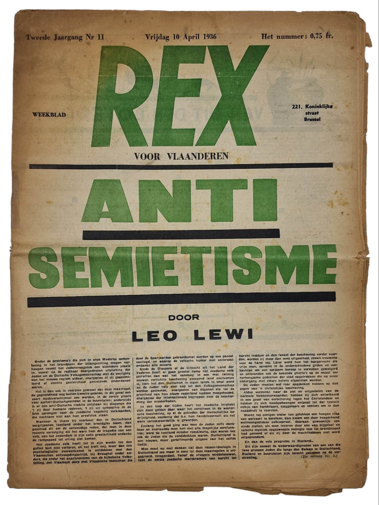 Original WW2 Flemish Collaboration REX Newspaper - REX voor Vlaanderen 2nd Year No. 11 (1936)Damaged, a few repairs with acid-free tape.Originele Wo2 Vlaamse Collaboratie REX Krant - REX voor Vlaanderen, 2de Jaargang No. 11 (1936)Beschadigd, enkele reparaties met zuurvrij tape.