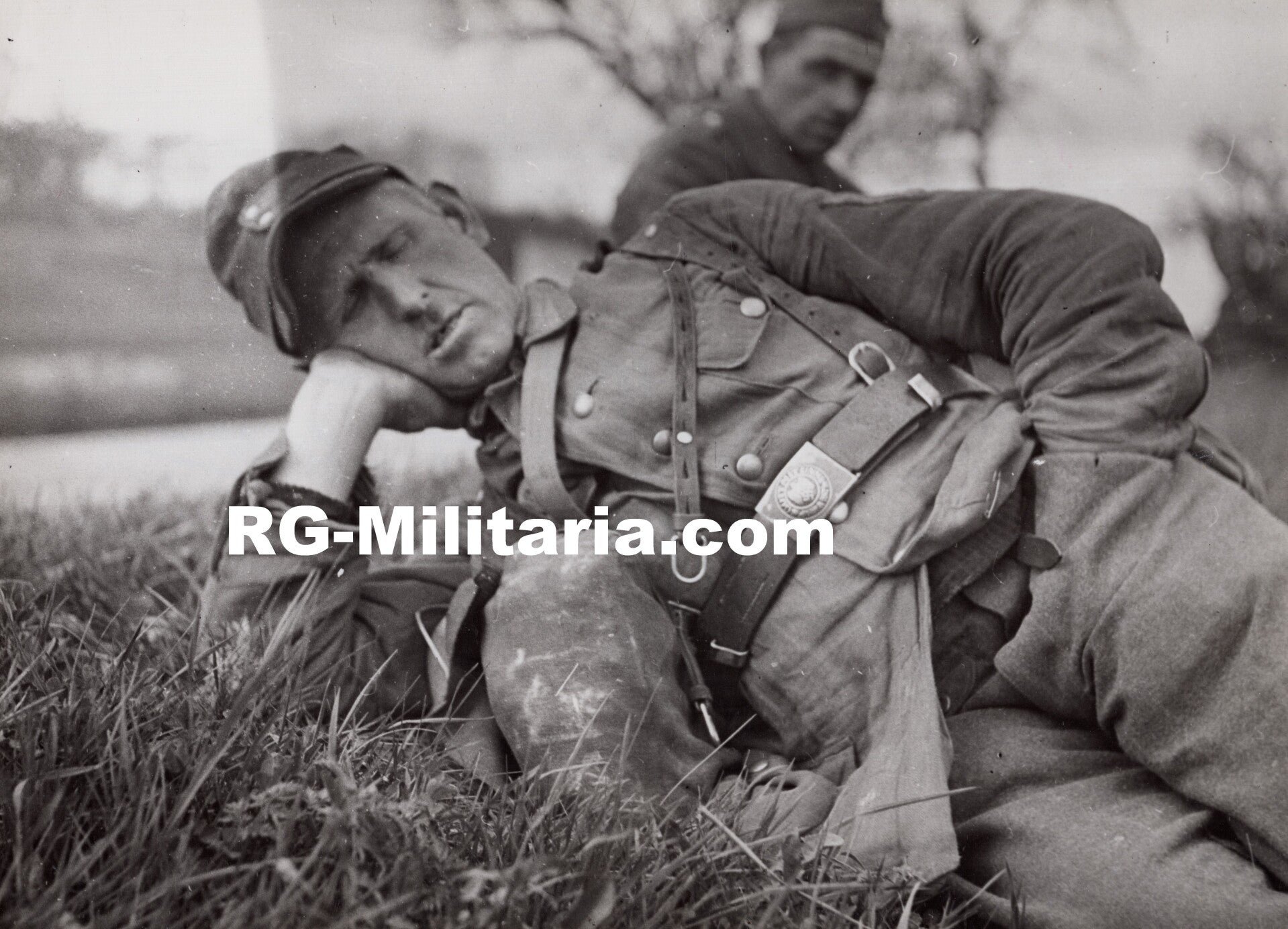 Original WW2 French Press Photo - Captured German POW soldier sleeping (1945)Approximately 25 x 18 cmMade by Maurice Zalewski, a French War Correspondent.Originele Wo2 Franse Persfoto - Gevangengenomen Duitse POW soldaat slaapt (1945)Ongeveer 25 x 18 cmGemaakt door Maurice Zalewski, een Franse oorlogscorrespondent.