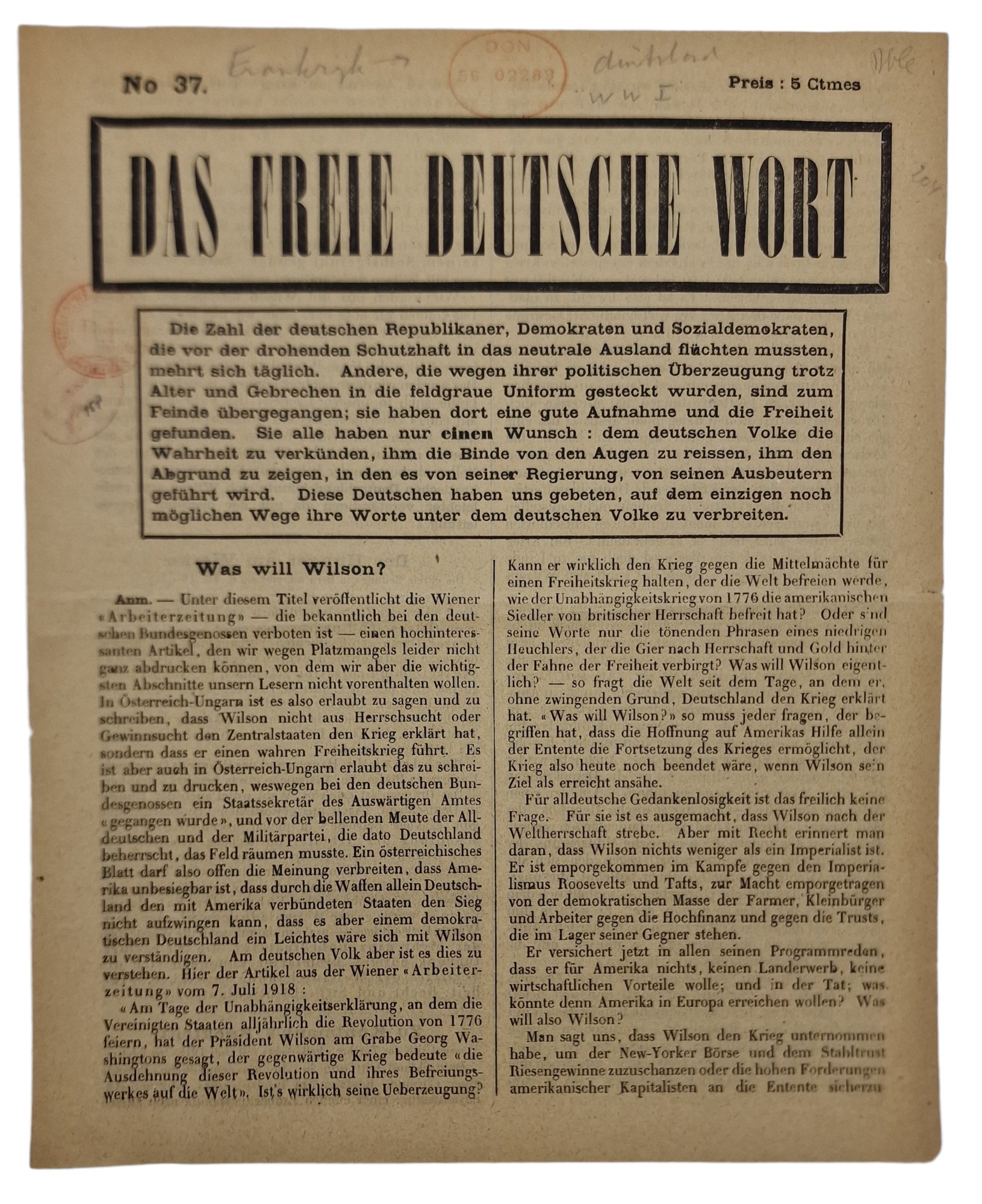 Original WW1 French Leaflet - Das Freie Deutsche Wort No. 37 (1918)