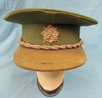 Original era manufacture. Green wool covered hat body and visor, with a red diamond shaped oilcloth sweatshield and leather sweatband.On the front of the hat, is a stamped metal insignia, diamond shaped with crossed swords, at center is the rampant lion of Czechoslovakia. Twisted silver wire chinstrap with plain side buttons, and a single silver wire stripe around the base of the cap band.There are some minor, scattered moth issues, but nothing detracting. Hat size is about a 56, normal age and wear overall.