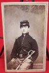 Original period photography. A very fine study of a seated Massachusetts Light Artillery Private, wearing his forage cap with insignia, shell jacket with shoulder scales, mounted waistbelt with shoulder strap, and cradling his M1840 light artillery sabre in the crook of his arm. Boston photographers logo on the reverse, Geo. C. White.