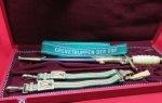 Original era manufacture. New condition, serial number 04727 engraved on the blade ricasso. Comes with green wool backed, gilt metal fittings hangers and belt loop. Two Grenztruppen Der DDR cuff titles were in the box at the time of our purchase. Handsome imitation red leather covered case with two locking clasps.