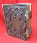 Original period manufacture. Pressed leather covers with brass fittings. Inside are 15 heavy card pages which will accommodate 30 CDV images. Wear and scuffing to the surfaces, with gilt decoration. The pages are sound, no tears or breaks in the paper covering. Overall the album is sound for it's age, the only issue is that the front cover has torn away from the interior cover paper. The brass clasps work properly.