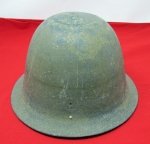 Original era manufacture. An elongated skull with a flared rim, all aluminum construction. No liner or chinstrap, white kanji characters painted inside the shell.