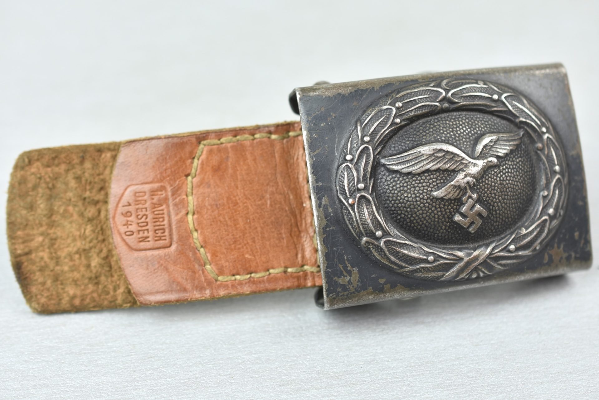 Light worn Luftwaffe belt buckle executed in steel. Retaining most of its genuine blue finish. Maker marked on the leather tab by Hermann Aurich, Dresden, dated 1940. The reverse of the steel buckle is also marked with the factory logo of H. Aurich.