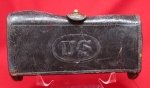 Original era manufacture. Black leather pouch with the swell on one side to fit the rifle tool.All black leather construction, with two rows of 10 canvas loops for 45-70 cartridges. With the brass escutcheon on the closure strap.Clear Rock Island Arsenal markings on reverse at the base of the securing strap, and very clear US in an oval on the front side of the pouch.Very sound pouch overall. Measures 7 3/4 inches in width