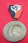 Original era manufacture. Bronze medal with the profiles of Hitler & Hindenburg on the obverse. Red-White-Black ribbon with an embroidered swastika. Medal measures 30 mm.