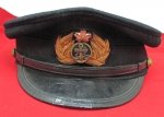 Original era manufacture. A very nice quality example with a dark blue wool body with a removable black mohair quilted cap band. On the front of the hat is a very nicely toned gold bullion officers cap emblem.Patent leather chinstrap and bound visor, the chinstrap being secured with two gilt brass navy pattern buttons. Black oilcloth sweatband with a typical maroon silk lining.The lining displays typical age and wear, the sweatband is intact and sound, also displaying normal wear. No moth issues to the wool, and the hat displays well.