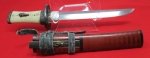 Original era manufacture. A beautiful example of the sword makers art, eight inch blade made from an cut-down sword, the tang is unsigned. Very attractive and very clear temper line on each side of the blade.Fine quality guard with a floral decoration, the collar and pommel cap are similarly decorated with gold highlights. Matching menuki in the shape of a Dove, again with gold decoration. Fishskin covered grip made without the need of cloth binding.Wooden lined scabbard with an exterior covering of segmented bands in dark red, with a black cap at the base and scabbard throat. There is a small knife in the scabbard body with a gold decorated handle, with two kanji on the blade.Original cloth wrapping around the scabbard body and in a correct style 'tie'.Overall a beautiful old weapon, priced at what you would pay for a 1st Model Luftwaffe dagger.