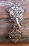 Original period manufacture. Stamped alloy tinnie with a silver wash finish, pinback reverse, measures 30 x 55 mm.