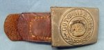 Original era manufacture. Stamped steel, enlisted, two-piece buckle with a matt gray finish. Original sewn brown leather adjusting tab with the makers name and 1916 date. Center disc dented from service use. Normal age and wear.