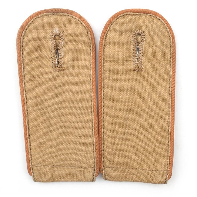 Nice pair of Luftwaffe Tropical Signals shoulder-straps as intended for a 'Soldat der Nachrichten'. The shoulder-straps are having the orange-brown branch-colour ('silk-like') piping. The straps are showing minimal traces of storage, the straps come on their functional tongues, the straps measure approximately 10cms in length. Nice original pair, the set can easily be used to complete a Luftwaffe tropical jacket or shirt with. A nice and scarce original pair of tropical shoulder-straps in very good, mint and unissued, condition!