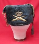 Original era manufacture. A handsome piece of headgear, real fur busby, with a gilt crown and crossed cannon at front. Red wool kolpak with gold tassle and trim. Linked brass chinscales with black velvet backing material, secured to the sides by lion headed bosses.Wide, brown leather sweatband and liner similar in pattern to a WWII German liner. Red leather top lining with six ventilation grommets and gilt lettering.The busby is quite sound, with no real condition issues; missing its top front field badge. A special thanks to Michel who corrected our error in originally identifying it as a Belgian busby.