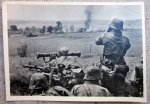 Original period manufacture. Sepia image of a Waffen-SS heavy MG crew on the outskirts of a Russian village. Creased in the upper right corner.