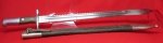 Original era manufacture. Massive sawback bayonet with a 19 inch steel blade and saw edge spine. Maker marked on the ricasso, Waffenfabrik Neuhausen.The blade displays a bright steel finish with no age staining or corrosion issues, bright and clean overall. Old chrome finish to the other metal components, with the serial number 77499 stamped into the guard. Original finish wood grips displaying minor marring from age and wear. Leather bodied scabbard with sound stitching, some scuffing to the edge and body surfaces.