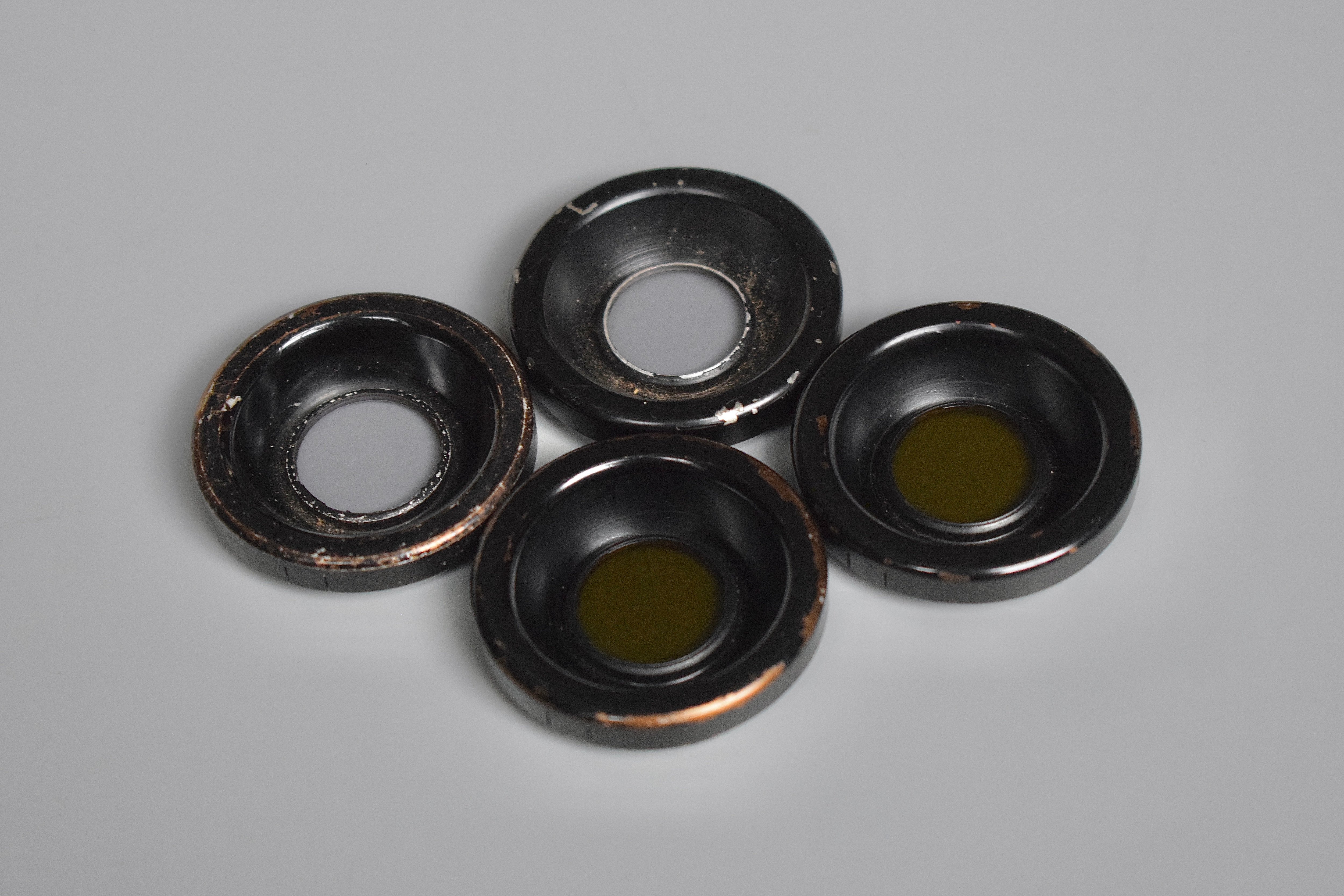 A full set of 4x sun filters as issued specifically with variousKriegsmarineissue 7x50 binoculars; including 2x grey and 2x yellow filters.Almost impossible to find these key accessories for sale separately - perfect to complete any binocular / storage case which no longer has them present!