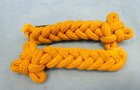 Original era manufacture. Pair of braided yellow wool shoulder knots with leather attaching straps. Shows some scattered fraying from service use.