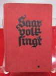Original era publication. German WWII Songbook with Hitler Youth photo. Saar-Volk Singt. Pocket size, red cloth covers 187 pages. Normal handling and wear.