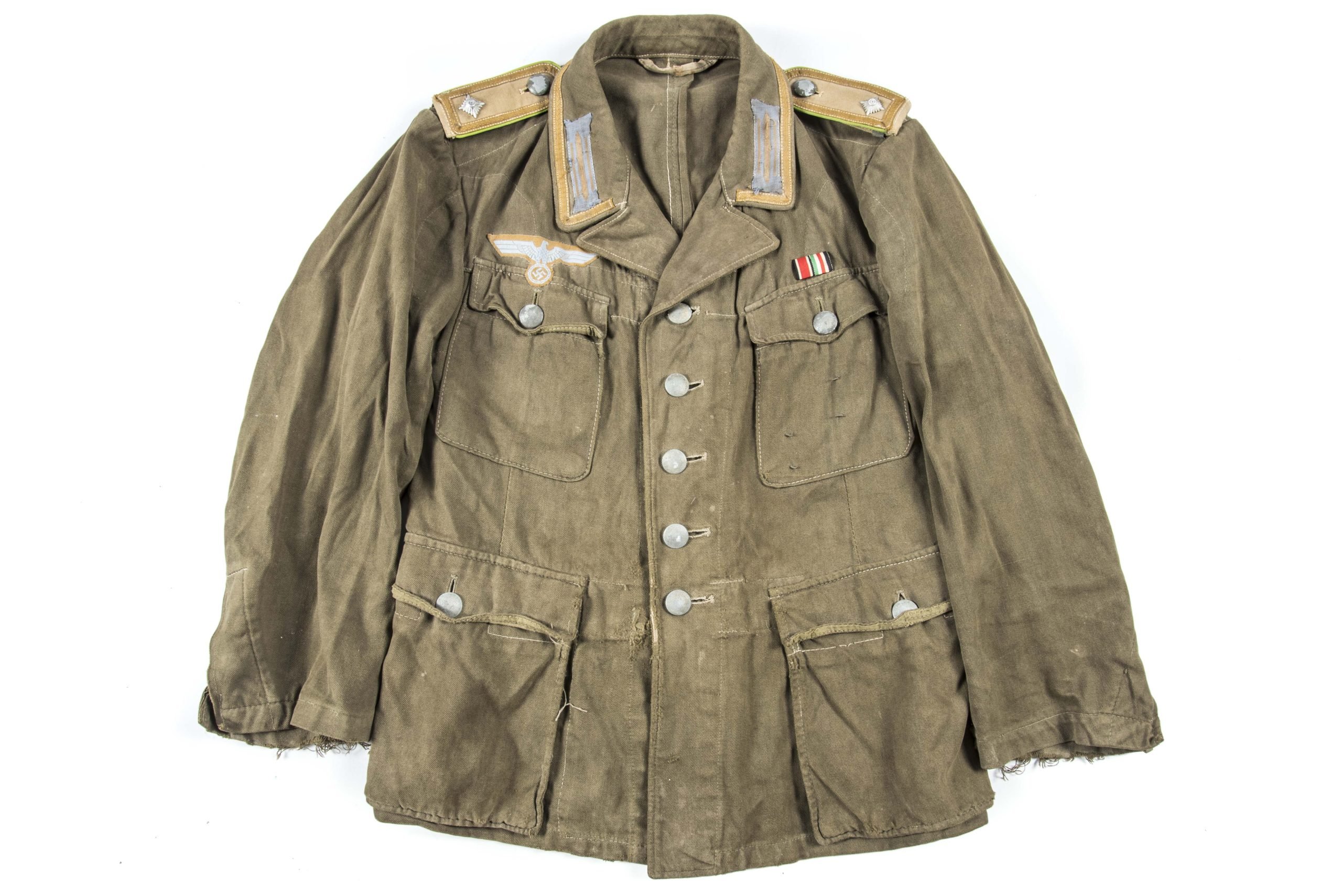Heer NCO tropical field blouse for a Feldwebel der Panzergrenadiere in good used condition. The garment shows a lot of character. The garment has its insignia expertlyresewn, exactly the way it would have been out of the factory. The shoulderstraps are added and in my opinion very goodreproductions. The garment is otherwise a nice display piece with two period sewn award loops and a small ribbon bar!