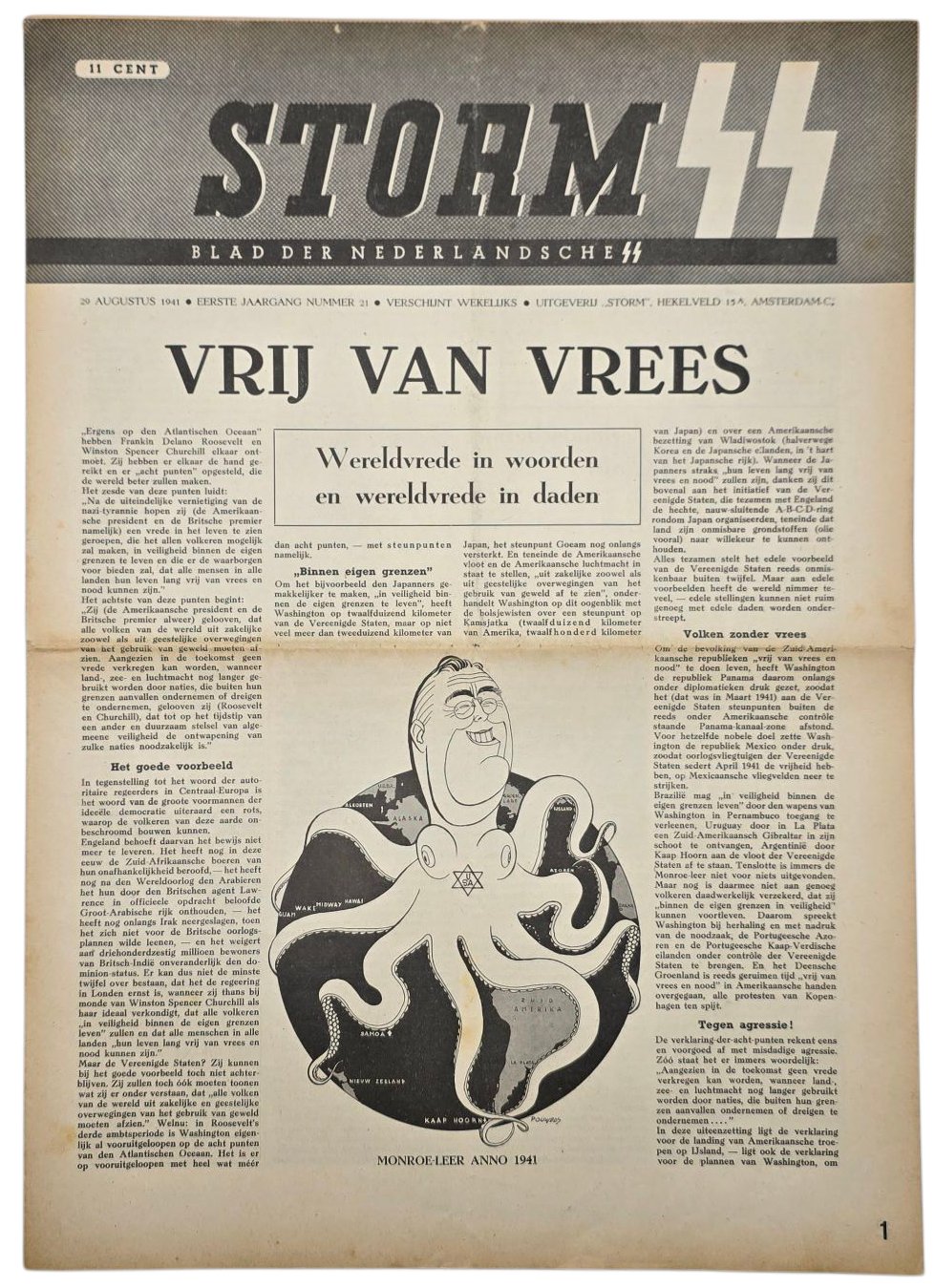 Original WW2 Dutch Waffen SS Newspaper - Storm SS 1st Year No. 21, Antisemitic cover(1941)Storm SS was the newspaper for the Dutch Waffen SS sympathizers. The newspaper began in 1941 and ended in May 1945. The newspaper often shows (Dutch) Kriegsberichter photos, political articles, and caricatures.Originele Wo2 Nederlandse Waffen SS Krant - Storm SS 1ste Jaargang No. 21, Antisemitische omslag (1941)Storm SS was de krant voor de Nederlandse Waffen SS-sympathisanten. De krant begon in 1941 en eindigde in mei 1945. De krant toont vaak Kriegsberichter-foto's, politieke artikelen en karikaturen.