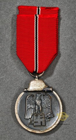 German WW2 Russian Front Award-Great example with a short portion of original issued ribbon still attached. This example is constructed in silvered and blacked zinc, which is just stunning. Very good example of this 'frozen meat' medal.History: The Russian Front Medal was instituted by Adolf Hitler on May 26th, 1942 to commemorate the first winter campaign in Russia. The award was available to all Wehrmacht personnel, civilians and foreign volunteers who met the required criteria with the main qualification being at least fourteen days of participation in combat on the Russian front between November 15th, 1941 and April 15th, 1942 within preset geographical boundaries or a minimum of two weeks of combat, have 30 days over enemy territory as flying personnel, being wounded or getting a frozen limb for which the wound badge was awarded, or a minimum of 60 days continuous time the combat zone.