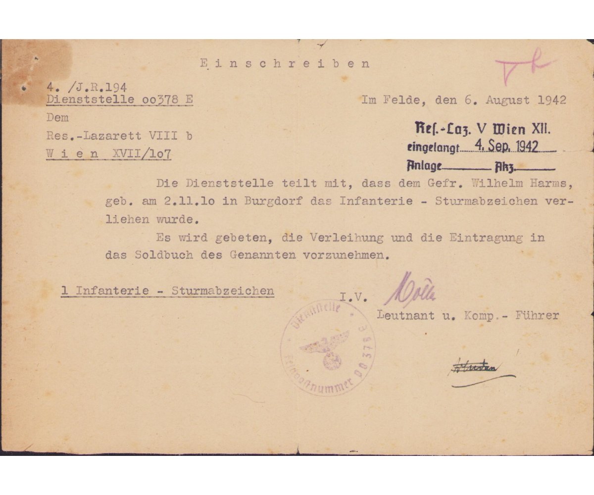 Inf.Sturmabzeichen Announcement Letter