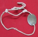 Original period manufacture. WWII oval shaped Japanese military identity disc of toned brass with numerous individually hand stamped characters. Simple white neck cord, perhaps collector applied.
