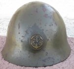 Original period manufacture. WWII Japanese military helmet, re-issued by Thailand after WWII. Dark OD overpaint, with spring steel clips inside to hold the Thai liner in place. The Japanese internal liner loops were removed. On the front is an interesting brass helmet badge, perhaps Japanese, displaying a Naval anchor and crossed hammers. Likely installed by a previous owner.