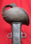 Original period manufacture. Full length example of this large pattern sword, last model issued to the US Cavalry. The blade is quite clean, no issues and runs straight and true, measuring 35 inches in length. Original dark finished steel guard with black plastic grips. Wood bodied scabbard covered in original age-darkened canvas covering, original finish throat and chape. Overall the sword is in original finish, displaying honest age and never improved upon or modified.