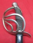 Original era manufacture. German Imperial era child's sword (Kindersabel) made in the form of a cuirassier officers sword with nearly the same quality as a full-size service modal. The overall length is 28 inches with a 23 inch, triple etched, polished steel blade, which runs straight and true out to the rounded sharp point. Plated steel patina basket guard and pommel, with a fish skin wrapped grip bound with triple strand wire just like Papa's sword. Lightly dented black painted steel scabbard, with most of the original finish remaining.