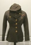 Original era manufacture. US WWII Army WAC officer jacket. Dark Olive Drab winter uniform. Officer metal shoulder bars, cutout officer US collar brass WAC collar insignia. Shoulder sleeve insignia for 15th Army Group, commanded by General George Patton until 1945.Front closure with 4 standard buttons embossed with US Army coat of arms. Smaller embossed buttons are on the epaulets and on the flaps of the false bodice pockets. Two slit pockets at the skirt of the blouse. Sleeve cuff insignia to indicate time overseas. Four place medal bar above top pocket.30 inch Bust21 inch Sleeve length24 inch Jacket lengthNice condition with no stains. All buttons and metal insignia are present.Original period manufacture. Olive green wool hat nicknamed for the commander of the WAAC/WAC Program, Colonel Oveta Culp Hobby. Very clean condition. Olive green imitation silk lining. Size marked in the sweatband 22 1/2. A very good looking hat with a shiney bright officers eagle on it's front.