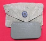 Original period manufacture. Unopened US Army OD painted metal bodied Carlisle bandage, residing in a single snap, pointed flap, light OD canvas belt pouch. Maker marked and dated on the reverse, faint US stencil on the flap.