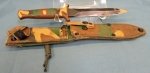 Original era manufacture. Camouflage finish to grip and scabbard, with a black finish to the blade. The knife displays wear and use, with the soldiers name written on the reverse.No corrosion issues, or overly sharpened