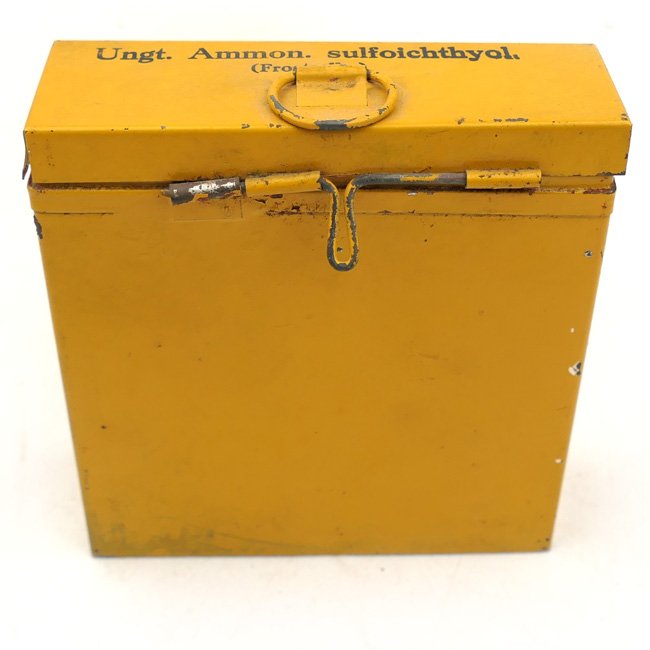 Small metal Wehrmacht medical Ointment Storage Box (Blechbehälter) intended for 'Frostsalbe'. These boxes were standard issue equipment in the larger medical boxes. The box is painted in yellow and is sized approximately 11 x 10,5 x 3,5 cms. The box is in good used condition, see photos. Nice and decorative original box!