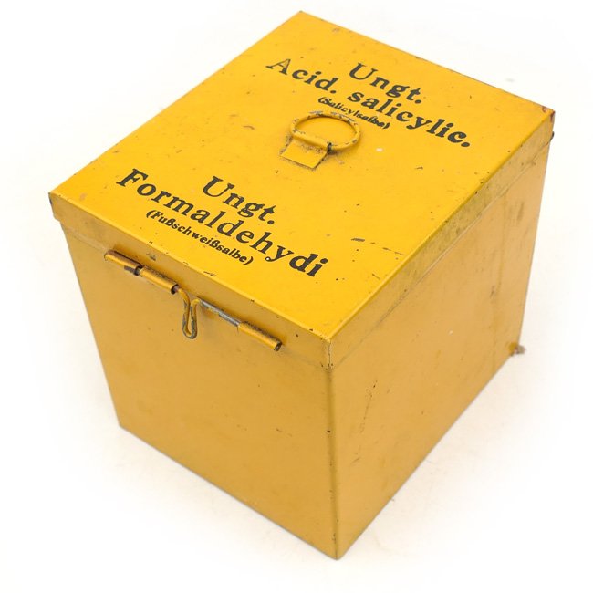 Small metal Wehrmacht medical Ointment Storage Box (Blechbehälter) intended to hold 'Salicylsalbe' and 'Fußschweißsalbe'. These boxes were standard issue equipment in the larger medical boxes. The box is painted in yellow and is sized approximately 11 x 10,5 x 12 cms. The box is in good used condition, see photos. Nice and decorative original box!