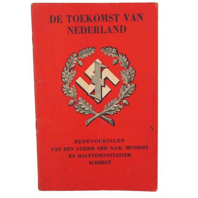 NSB Booklet 'De toekomst van Nederland, redevoeringen van den leider der N.S.B. Mussert en Hauptdienstleiter der N.S.D.A.P. Schmidt'. The booklet features 42 pages and is in overall good condition. Decorative original booklet!
