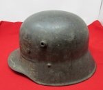 Original era manufacture. Dark patina finish to the surface, with scattered areas of light surface corrosion. The metal liner band is intact; still secured by its three original rivets. We have not made an effort to clean the helmet, the width measures nine inches across at the bottom of the helmet skirt.