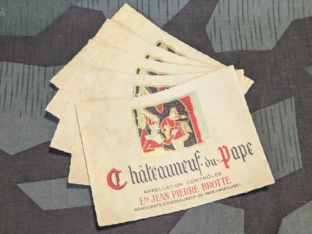Lot of 5 period French Châteauneuf du Pape wine bottle labels. These are unused labels in decent condition with some minor storage wear and discoloration.
