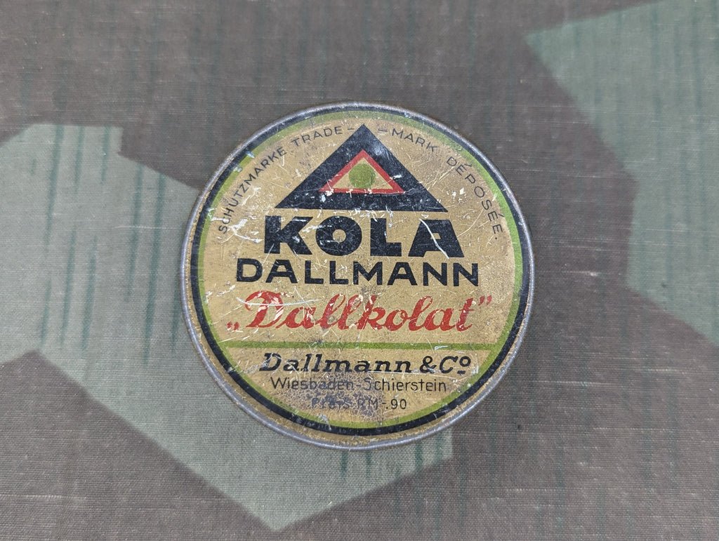 Original prewar Kola Dallmann Dallkolat energy drops tin. This contained small tablets of caffeine that you were just supposed to eat like a piece of chocolate. 'The standardized wholesome stimulant from the kola nut.' The back mentions being produced for over 40 years (the 50-year anniversary of the company was 1939). Price is in RM (Reichsmarks). It is in decent condition with wear and discoloration. There are scratches and some darkening where the price is.